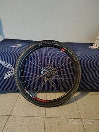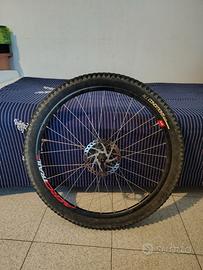 ruote da 27,5 per MTB con dischi da 160 mm, pacco pignoni SRAM da 8 velocità un po' usurato, gomme in ottime condizioni e cerchi con leggeri graffi.