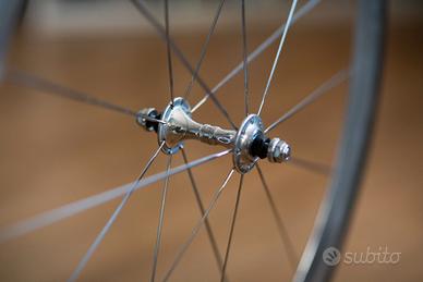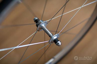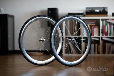 Vendo per inutilizzo, coppia di ruote Campagnolo Shamal 16 da pista vintage. Le ruote sono in buone condizioni, perfettamente funzionanti, dritte e scorrevoli. Mozzo campagnolo anteriore e Gipiemme al posteriore. Presentano qualche segno di utilizzo sui profili. Posso fornire altre foto su richiesta. Vengono vendute con palmer Vittoria Corsa Graphene 2.0 700x25 come nuovi ancora da incollare. Scambio volentieri con Brompton, Mtb Specialized rockhopper, Stumpjumper, Hardrock oppure con telai Colnago Master, De Rosa, Pinarello, Cinelli Mash.
