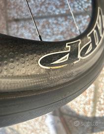 ruote Zipp 404 in carbonio, con una segno di riparazione dovuta a rottura cerchio. Ruote originali montano solo tubolare gomme nuove (cerchio anteriore riparato per rottura, ma ora funzionante) .. cerchi per freni a RIM