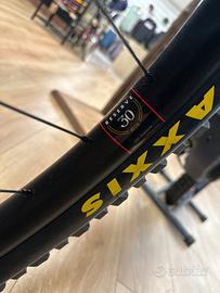 Le sospensioni Fox Performance, con 160 mm di escursione davanti e 150 mm dietro, offrono un comportamento solido e progressivo anche sui terreni più sconnessi. I cerchi Reserve in alluminio assicurano affidabilità e resistenza, mentre la trasmissione SRAM 90 e i freni SRAM Maven Bronze completano un allestimento pensato per un utilizzo enduro aggressivo, con potenza frenante elevata e grande controllo.