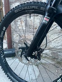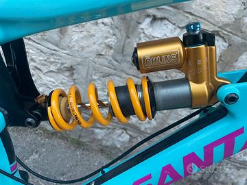 Monta al posteriore un ammortizzatore öhlins da 160 mm a molla e una forcella rockshox pike ad aria sempre da 160 mm entrambi regolabili sia di compressione che ritorno. Monta freni sram guide r 4 pistoncini spurgati e revisionati con dischi shimano XT da 203 all anteriore e 180 al posteriore. in fine monta un manubrio raceface Ø3, manopole campabros e comando marce sempre deore XT inoltre é presente un reggi sella telescopico con manettino al manubrio. La bici presenta normali segni di usura dato che é sempre stata usata su sentieri e montagne.
