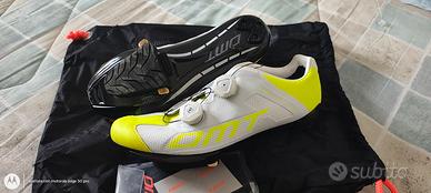 scarpe per bici da corsa DMT R1S modello con suola in carbonio e chiusure boa, usate per 2/3 uscite, un po' grandi per il mio piede, le scarpe sono n.43 come da etichetta.