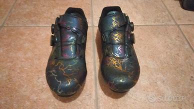 Vendesi scarpe per bici da corsa colore grigio con disegni multicolor iridescenti numero 44. Nuovissime utilizzate due volte e dismesse per taglia sbagliata.