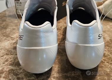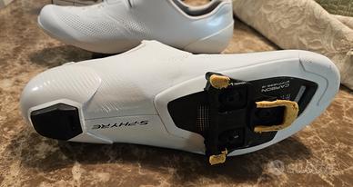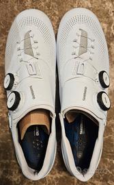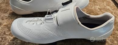 Vendo scarpe da ciclismo top di gamma Shimano modello S-Phyre RC9 (SH-RC903), colore bianco, taglia 42. Scarpe utilizzate pochissimo, praticamente pari al nuovo. Nessun segno rilevante, perfette sia esteticamente che funzionalmente. 🔧 Caratteristiche principali: Doppia chiusura BOA per regolazione precisa Suola ultra rigida in carbonio (massima trasmissione di potenza) Vestibilità racing, molto performante Compatibili con sistema SPD-SL 📦 Fornite con scatola originale. 💰 Prezzo: 190€ Vendo per inutilizzo.