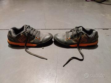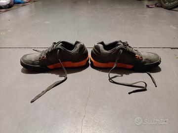 Vendo scarpe da ciclismo Five Ten Freerider con la suola in gomma Stealth, nella combinazione di colori nera e arancione, ideali per MTB e downhill.