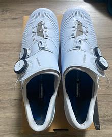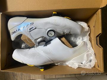 Vendo per cambio progetto, scarpe ciclismo Shimano S-Phyre RC 903 bianche, misura 43 pianta larga. Presente oltre la scatola anche i 3 differenti spessori Shimano per le solette. Scarpe in perfette condizioni, (pari al nuovo) solo piccolissimi segnetti dovuti al normale utilizzo. Prezzo leggermente trattabile.