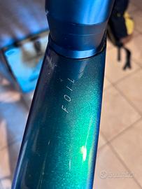 Scott Foil 10 taglia M Verde-Viola-Nera Come nuova Specifiche: telaio in carbonio (HMF F01 Aero Carbon Technology), gruppo elettronico SRAM Force eTap AXS (cassetta 10-33T, guarnitura 48/35T), freni SRAM Force eTap AXS HRD (disco idraulico, rotori 160/160 mm), ruote Syncros Capital 1.0 50 Disc, gomme pirelli, sella Syncros, piega Syncros Creston iC SL Carbon combo, peso 8 kg.