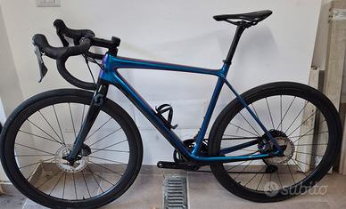 Telaio e forcella in Carbonio Addict Gravel HMX misura M, gruppo Shimano GRX 800 2x11 velocità, guarnitura Shimano GRX 600, freni Shimano GRX disco idraulico, ruote Sincros Carbonio, pneumatici Pirelli Cinturato Tubeless, sella Sincros, la bici è senza pedali.