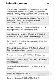 Scott scale 915 tg L anno 2018 (io 184 cm). In inverno usata configurazione gravel (corone 40-24 e copertoni ciclocross latticizzati) e in estate in configurazione standard (corone 34-24 oppure 34-22 con copertoni mtb latticizzati). Dietro cassetta 11-40 e 11-42. Nella vendita sono comprese le corone di entrambe le configurazioni. Presente ovviamente qualche segno d'usura. Causa recente clonazione dell'account, onde evitare che risucceda, tutti gli eventuali messaggi verranno eseguiti esclusivamente sul sito.