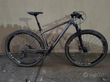 MTB Vendo per passaggio a full, taglia M in perfette condizioni, perno passante avanti e dietro, comando forcella al manubrio, tutta pellicolata, in perfette condizioni esteriche e funzionali, tenuta e manutenzionata regolarmente, con diversi componenti acquistati NUOVI tra cui: -Cerchi DRC big hit canale interno 27 -Pedivelle SLX -Corona 32 XT -Reggisella in carbonio (in dotazione anche originale) Possibilità di telescopico Venduta con pasticche nuove Possibilità di pedali SPD
