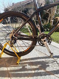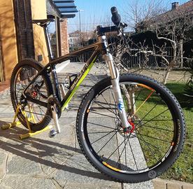 Telaio in carbonio, gruppo xt-xtr 9v, ruote da 26 Mavic crossmax slr tubless, gomme nuove tubless, forcella Fox da 32 corsa 100, porta boraccia. No pedali. Peso 10,5 kg.