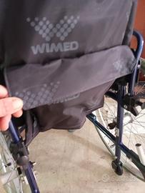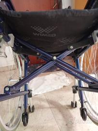 Sedia a rotelle leggera e pieghevole, ideale per spostamenti. Mancano poggia piedi.