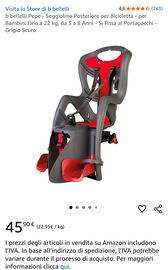 SEGGIOLINO DA BICI PER BAMBINI POSTERIORE - Per bambini fino a 22 kg di peso, da 3 fino a 8 anni di età. Compatibile con ruote della bicicletta di raggio 26'' - 28''. si attacca al portapacchi e ha un'ulteriore cinghia di sicurezza, molto pratico, consente di spostarlo da una bici all'altra in maniera pressoché istantanea. Consegna in zona EUR/Fonte Meravigliosa/Cecchignola
