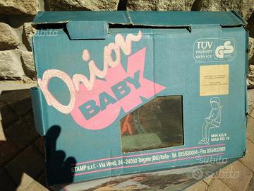 seggiolino Orion di ok baby, da montare in senso di marcia, con cinghie di sicurezza e padiglione ferma bimbi, per bimbi sono a 15 kg, poggiapiedi regolabile in altezza, smontabile anche su bici elettriche.