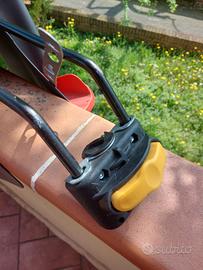 seggiolino per bicicletta con spalline e poggia piedi regolabile. il blocco va serrato alla bici e il seggiolino si fisserà rapidamente, solo quando servirà