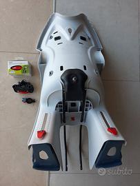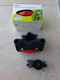 Modello Decathlon con attacco e stacco con un clic per bicicletta (sono compresi assieme 2 blocchi attacco-stacco per due bici). Imbragatura di sicurezza a 5 punti. Proteggi gambe centrale, cinghia di fissaggio ulteriore a sellino (sicurezza aggiuntiva). Posizionamento opzionale del Poggiapiedi che è regolabile in altezza e assicura i piedi con cinghietta. Adatto per biciclette con tubi rotondi e ovali.