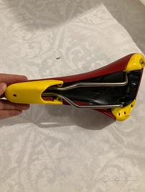 Vendo sella fizik (fi’zi:k) nera rossa e gialla. Presenta una leggera imperfezione sulla pelle nella parte posteriore destra come in foto, ma non compromette la funzionalità.