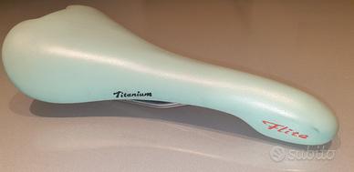 Sella Flite Titanium originale anni 90 prodotta da Selle Italia in colorazione Celeste Bianchi CK, nuova, mai usata, in confezione originale (danneggiata).