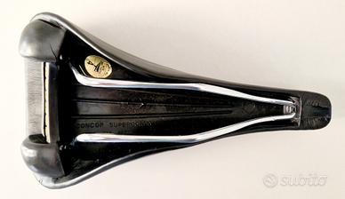 Vendo RARA sella bici vintage ORIGINALE San Marco Concor Supercorsa Confort NUOVA MAI USATA,in CONFEZIONE ORIGINALE DELL'EPOCA (anni '80),con istruzioni allegate,in PELLE NERA,binari in acciaio cromato,lunghezza 27 cm,larghezza 14 cm,peso 347 grammi;garantita max serietà astenersi perditempo grazie...