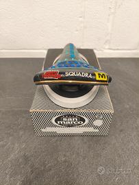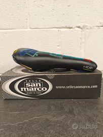 Vendo sella originale Selle San Marco Racing Pro – NO SLIP SYSTEM, modello "Squadra Corse" con grafica multicolore e simbolo “M” nera su sfondo giallo.