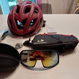 Set adulto completo per mountain bike con casco, occhiali, borsello da telaio.