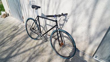 Vendo questa single speed utilizzata molto poco, completamente funzionante e pronta all'uso. Taglia M / L (tubo orizzontale: 56; tubo verticale: 54,5). Catena cambiata poco tempo fa (fatti circa 10 km). Possibilità di girare la ruota posteriore e scegliere tra pignone a ruota libera o fisso. Unica cosa da cambiare sono i copertoni che ha adesso, che sono da bici da corsa, che avevo da parte ma sono un po vecchi e delicati per l'uso quotidiano. Per il resto nessun lavoro da fare. Campanello non incluso. Vendo fissando incontro vista e piaciuta.
