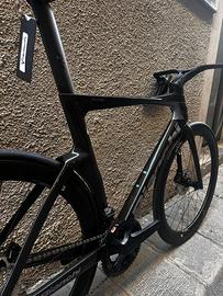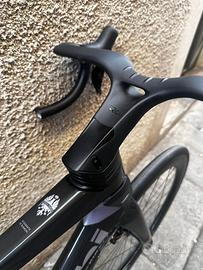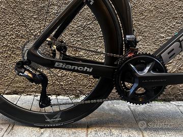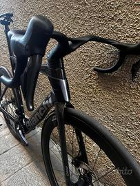 Full Carbon aero con Bianchi CV, freni a disco, testa integrata da 1,1/4", pinza flat mount, perno passante 12x100mm