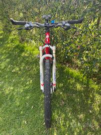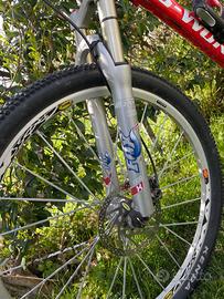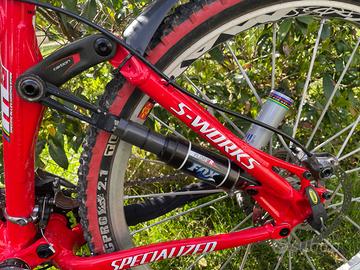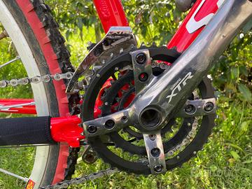 Vendo splendida Specialized S-WORKS Epic 26", misura Small, colore rosso. Per gli appassionati nostalgici sognatori di splendida gioventù, ma anche per giovani curiosi di un mezzo assolutamente performante oggi come tanti anni fa. Telaio alluminio. Forcella Fox F 100 TSerralogic Ammortizzatore Fox Float R Forcella e ammortizzatore muniti del sistema Brain, che si attiva quando percepisce irregolarità del fondo, mantenendo rigidità sui terreni regolari. Freno anteriore Shimano XTR, disco Shimano 160 mm Freno posteriore Shimano XTR, disco Shimano 160 mm Manubrio nativo Specialized S-Works Carbon. Cambi anteriore e posteriore Shimano XTR Guarnitura tripla corona Shimano 44-32-22 denti Blocco 9 pignoni Shimano da 34 a 11 denti Pedivelle Shimano XTR, pedali Shimano SPD Reggisella e pipa manubrio Thomson Sella San Marco probabilmente Aspide Arrowhead Il telaio presenta piccole e inevitabili abrasioni, dovute all'uso smaliziato dei mountainbiker, più che all'età del mezzo. Spedizione disponibile tramite servizio Poste Delivery Express pacchi voluminosi al costo di euro 32,79 Visionabile in zona Noale. Non accetto permute né offerte al ribasso.