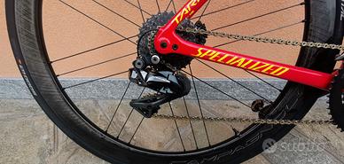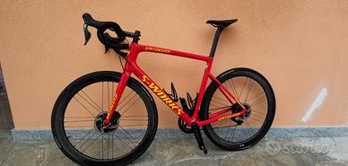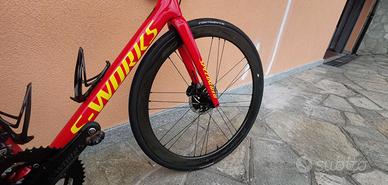 Vendo bici Specialized Tarmac S-Works SL6, TG 58, pari al nuovo, unico proprietario, con documenti e manuali, qualsiasi prova, totalmente in carbonio. Gruppo Dura Ace 11 V Di2 (pacco pignoni 11-30, freni, comandi), guarnitura 34-50 S-Works in carbonio, catena KMC SL Gold, ruote Campagnolo Bora WTO in carbonio da 45 mm (perfette), gomme Continental Gran Prix 5000 da 28 mm, montate Tubeless (front nuova, post 90%), manubrio e pipa S-Works SL in carbonio, sella S-Works Power in carbonio, doppio porta borraccia. Tutti gli elementi soggetti ad usura sono nuovi o quasi (gomme, catena, pacco pignoni, corone, pastiglie e dischi freno). Bici usata pochissimo e tenuta maniacalmente: non ha un graffio, e non è un modo di dire.
