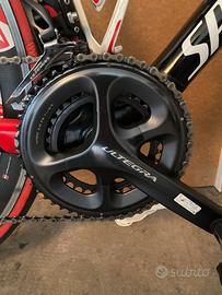 Ruote Vision T42 in carbonio, gruppo Shimano Ultegra con guarnitura compact 50-34 e cassetta pignoni 11v (11-28). Pedivelle 172 mm.