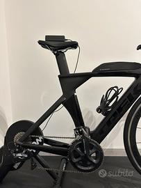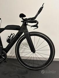 La bici è completa di tutto, dalla foto la bici e montata sui rulli ma entrambe le ruite sono presenti e in ottimo stato, utilizzata per una sola gara di Ironman a Jesolo.