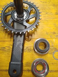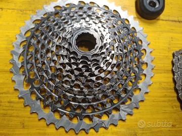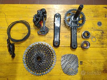 gruppo sram X0 rosso 12 velocità ,composto da cambio posteriore, comando, catena, guarnitura gxp ( 175mm) con corona (34 denti) cassetta 10/50, calotte movimento centrale in titanio.