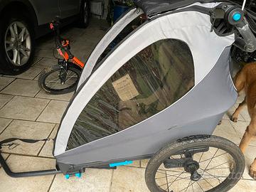 Rimorchio/trailer/carrello porta bimbi da attare alla bici può essere usato anche come passeggino dopo (ruota anterione va acquistata) in buono stato con cerniera rotta causa strofinamneto su muro, vendo per passaggio a seggiolino da bici, ammortizzato molto stabile e comodo per ogni stagione e temperatura