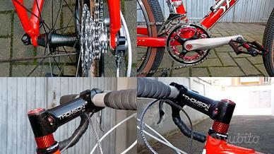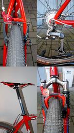 Montata in assetto gravel. Peso telaio taglia L: 1.690 gr; peso totale bici: 10.950 gr. Componentistica di buon livello in condizioni più che buone, visibile in foto (XTR, forcella Manitou Mars, comandi integrati Shimano M600 2x8, reggisella ammortizzato Rock Shox, Ritchey, Thomson Elite, coperture e camere nuove Schwalbe Billy Bonkers 26x2,1).