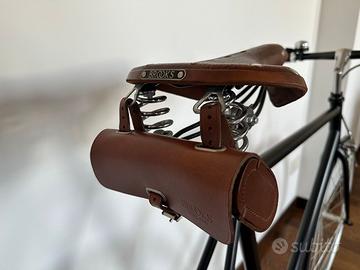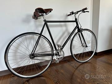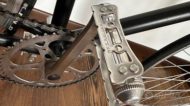 Bici artigianale retropedale, con aggiunta freno anteriore manuale. Sella cuoio Brooks, sacchetta cuoio Brooks, manopole coprimanubrio cuoio Brooks. Pedali classici alluminio. Da pista, velocità.