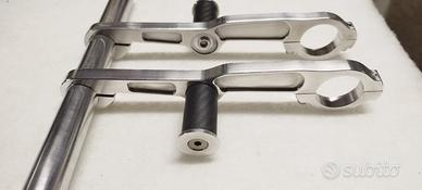 La staffa è costruita per poter fissare una borsa a tubo al manubrio della mtb o gravel in maniera tale che la borsa non interferisca coi cavi e con la ruota e allo stesso tempo lasciare il manubrio libero per poterlo usare in tutta la sua larghezza. Costruita in alluminio "ergal" e lucidata usa viti inox e titanio.