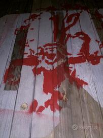 Elemento di arredo in stile "industrial" realizzato da artigiano in legno (trattato e cerato), con funzione di supporto per bicicletta, retroilluminato con led. Dotato di cavo di alimentazione e interruttore. La bicicletta (non inclusa) è sostenuta da una piastra in metallo per pedale e supporti in legno per le ruote. Dimensioni: cm 180 x 117.