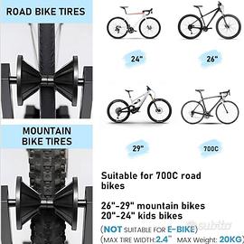 Ampia gamma di utilizzi: con la sua ampia adattabilità, il nostro prodotto può ospitare ruote di dimensioni che vanno da 20" a 29". La staffa anteriore è specificamente progettata per adattarsi a qualsiasi tipo di ruota da strada o mountain bike, fornendo una soluzione di parcheggio temporanea perfetta per ambienti interni ed esterni. (Si prega di notare che non è raccomandato per l'uso con biciclette elettriche pesanti.)