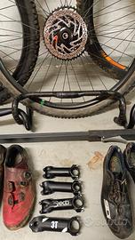 Vendo componenti ed accessori ciclismo, bici da strada, mountain-bike, gravel, ciclocross - rullo tacx galaxia con cinghia nuova 100€ - scarpe Shimano xc7 50€ -scarpe sidi Tiger 2 srs 50€ - ruote ambrosio E30 canale 30 NUOVE 150€ - ruota posteriore 29 syncros silverton XD 50€ - coppia Terravail Washburn 700x40 50€ - cassetta 12v 11-50 hg 40€ - Pirelli p zero tlr 700x28 30€ - vari attacchi manubrio 100 110 120 25€ CAD - manubri alluminio 44cm 30€ l' uno - manubrio 3t ergonova carbonio 70€ - schwalbe Nobby Nic 29x2.6 - schwalbe Nobby Nic 29x2.25 - Continental Mountain king 29x2.6 - vittoria zaffiro pro in regalo se richiesto Il prezzo delle ruote è riferito alle ruote nude, posso aggiungere copertoni, gomme e pacchi pignoni su richiesta. Preferibile consegna a mano, ma spedisco senza problemi. Per info e foto aggiuntive contattatemi