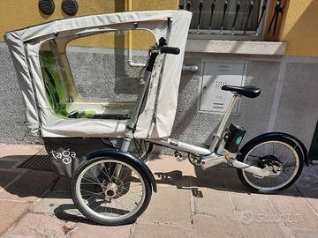 Comodissima Taga Cargo bike con pedalata assistita. Ottima autonomia, usata solo in città per trasporto bimbi (ormai troppo cresciuti). Dotata di levetta/acceleratore per aiuto in partenza. 6 velocità. Freni (3) a disco.Totalmente smontabile senza attrezzi per trasporto in auto. Ogni componente è facilmente amovibile e lavabile. Utilizzabile anche in inverno grazie alla cappottina in tela e pvc.