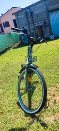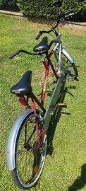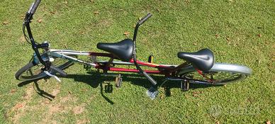 Tandem artigianale con cambio Shimano 6 rapporti, ruote 24 con pneumatici bicolore nuovi con ancora i peli dello stampo, copri valvole a led a forma di teschio trasparente si accendono col movimento del tandem, selle della Montegrappa bravo soft molto confortevoli, campanello antico marangoni armelino, impianto luci a dinamo posteriore funzionante, colore telaio bianco e bordeaux con decal riportanti la scritta Tempest 2000, freni cantilever con leve in lega, tutti i comandi sono al manubrio anteriore, interasse ruote 160 cm lunghezza totale 220 cm, distanza massima sella pedane 80 cm altezza massima sella 95 cm, (si può aumentare sostituendo i tubi delle selle. Smontando le ruote si puo caricare in station wagon, oppure intera su portapacchi a tetto o furgoncino. Peso 24kg Rif.240726149.