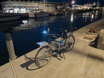 Pneumatico posteriore a resistenza migliorata. Presenti attacchi per seggiolino bimbi aggiuntivo. Vendo completo di caricatore per batteria e con tutti i pezzi per riportarlo eventualmente all’origine non elettrico. Regalo catenaccio di colore in abbinamento, campanello, luci anteriore e posteriore e due selle nuove. Visibile a Varese dal 20 agosto. Si puo caricare in macchina di media dimensione togliendo il secondo manubrio e la ruota anteriore. Perfetto per camper, dimensione compatibile con caddy portabici e lunghezza in sagoma. A titolo informativo in questa estate é stato usato tranquillamente con un carico “umano” prossimo ai 180kg!!! Spinta del motore decisamente soddisfacente, velocita di crociera superiore ai 25km/h.