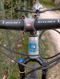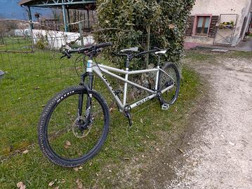 Tandem Vetta MTB con telaio in alluminio, componenti Ritchey e Shimano, misura L per il "capitan" e S per lo "stokker", freni a disco idraulici, ruote tubeless, cambio Shimano XT 10 rapporti con tripla, freni Shimano Zee con dischi da 203 mm all'anteriore e 180 mm al posteriore, forcella Rock Shox Reba, ruote da 29. Sempre revisionato. Vendo per inutilizzo. Il tandem, smontate le ruote, può essere trasportato su un normale porta biciclette da portellone posteriore perché ha l'ingombro di una bicicletta normale (vedi foto).