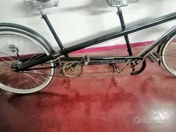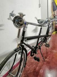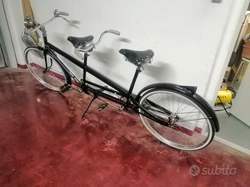 Questo tandem risale al periodo 1930 al 1945 Periodo Fascista che era adibito alle camicie nere anche per le ronde dava l'opportunità di usare un'unica bicicletta I freni sono a bacchetta il faro anteriore a candela e posteriore a olio è stato completamente ristrutturato cercando di rimanere fedele al periodo escluso il cavalletto come da foto le due cinghie in cuoi che sono visibili lungo il telaio presumo che siano per bloccare il moschetto o il manganello Ovviamente è un pezzo per amatori