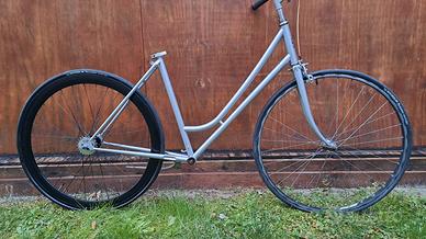 Telaio vecchia bici da passaggio da donna, sabbiato e verniciato a polvere grigio metallizzato qualche anno fa, e poi praticamente mai utilizzata. Compreso movimento centrale, serie sterzo e tubo sella del diametro esatto fatto al tornio (presenta ruggine)