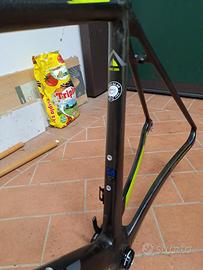TElaio full carbon, con forcella full carbon e tubo reggisella Oval full carbon. E' una telaio light da scalatore, peso in taglia 56 completa come da foto circa 1,3 kg. in seguito a caduta della bici da parcheggio si era scheggiato il tubo orizzontale che ho fatto riparare da una ditta specializzata in costruzione artigianale di telai in carbonio (Emmezeta..vedi foto). dai dettagli del tubo orizzontale si vedono le fibre nuove della riparazione.