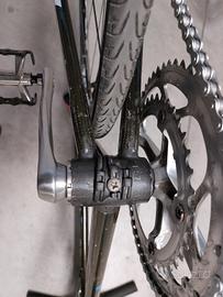 Taglia 56, leggerissimo, ha qualche segno del tempo come si vede dalle foto ma funziona perfettamente. Le ruote non sono comprese, insieme al telaio consegno: serie sterzo Shimano 105, movimento centrale Shimano e guarnitura doppia Shimano 105.