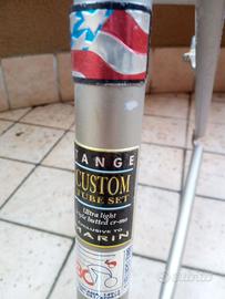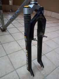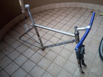 Telaio MTB Marin Pine Mountain con forcella Manitou Mach 5, attacco manubrio e manubrio Marin originali; anche la serie sterzo è marcata Marin. Reggisella compreso. Tubazioni in acciaio leggero Tange Custom Ultra light triple butted. Taglia 17,5 pollici.