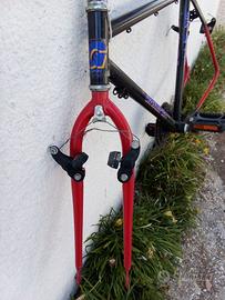 Telaio MTB uomo 26” Grimper - materiale acciaio - colore nero / rosso – completo di forcella, movimento centrale, corona 3 v, pedali, tubo sella – misure come da disegno - usato, in buone condizioni (qualche graffio e tracce di corrosione superficiale)