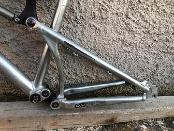 Vendo telaio Santacruz Nomad in SERIE LIMITATA polished, con questa colorazione ne hanno prodotti pochissimi esemplari e trovarlo in queste condizioni è quasi impossibile, è un telaio da collezione. Non è verniciato, è alluminio raw spazzolato e poi lucidato per un effetto a specchio. E’ una taglia L per ruote da 26” compreso di serie sterzo e ammortizzatore Fox. Può anche essere montata mullet montando forcella e ruota anteriore da 27,5”. Adatto ad altezze da 180 in su. Escursione posteriore 165mm. Possibilità di montare forcelle con escursione da 140mm a 180mm. Ammo da 216mm x 63mm. Per ruota posteriore quick release o asse passante da 10mm. Serie sterzo da 1-1/8”. Diametro tubo sella 30,9mm. Telaio da enduro leggero, molto polivalente, si pedala bene in salita ed è ottimo in discesa. E’ una delle pietre miliari della storia della mountain bike, era il sogno di tutti i riders, uno dei primi telai da enduro, escursione generosa e resistenza assoluta. Sono presenti qualche segno minimo inevitabile su una bici.